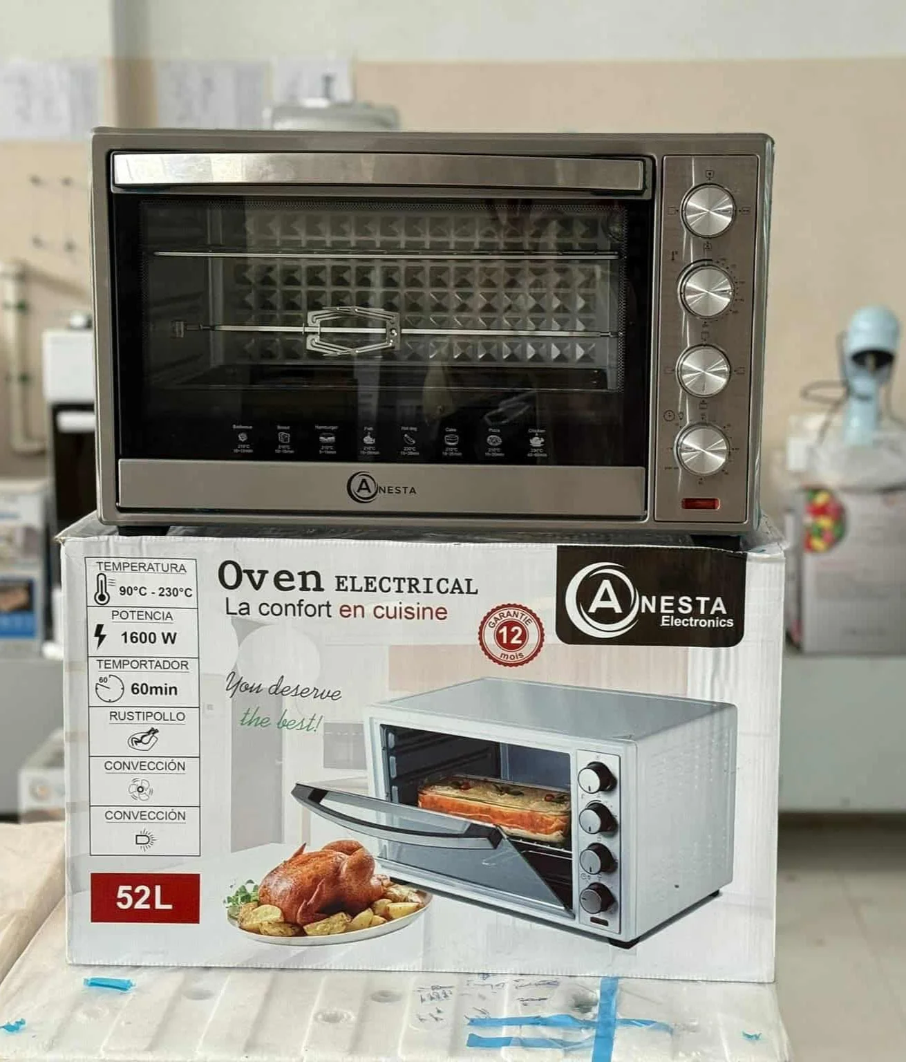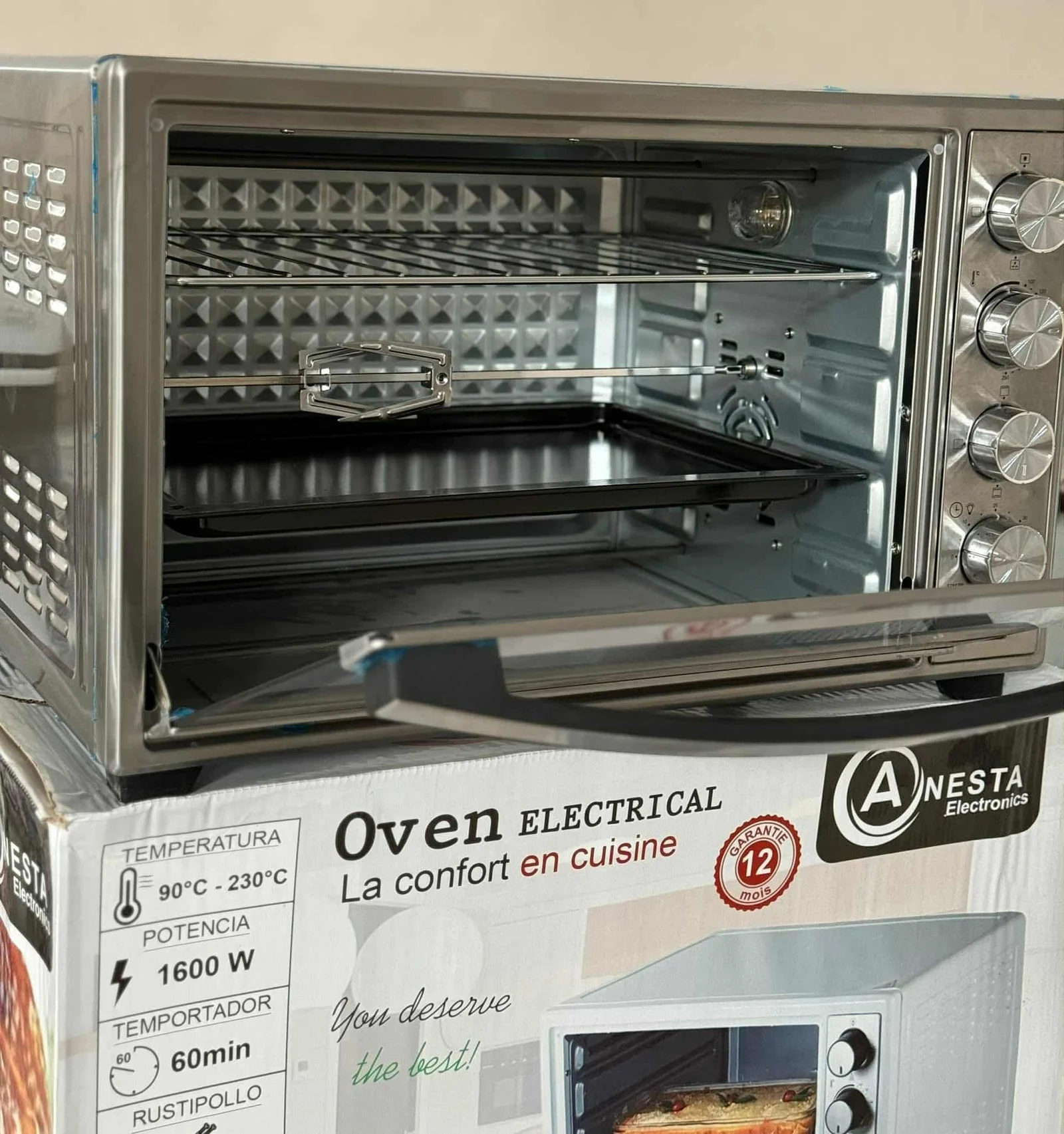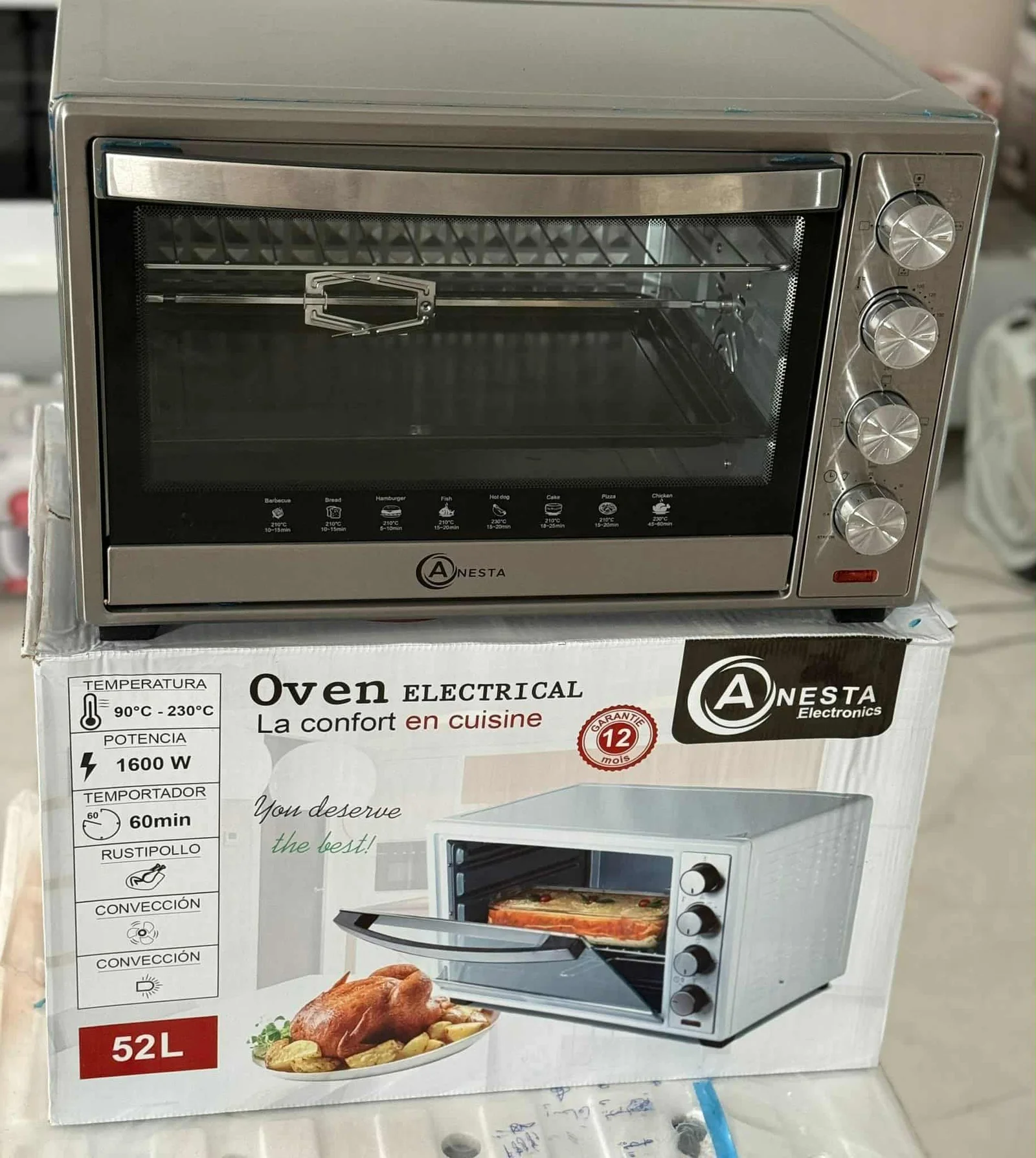 الفرن الكهربائي أنيستا (Anesta Electronics 12-002 SS) يتميز بتصميم عملي وسعة كبيرة تبلغ 52 لترًا، مع قدرة كهربائية قصوى تبلغ 1600 واط. يعمل بجهد 220–240 فولت وتردد 50–60 هرتز، ويحتوي على محرك مروحة بقوة 16 واط ومحرك شواية دوارة بقوة 6 واط. يمكن ضبط درجة الحرارة من 90 إلى 230 درجة مئوية، إضافة إلى مؤقت زمني يصل إلى 60 دقيقة مع تنبيه صوتي.