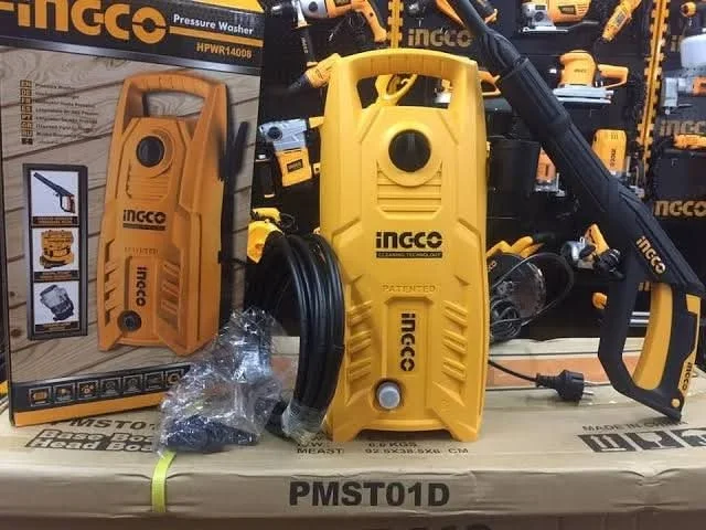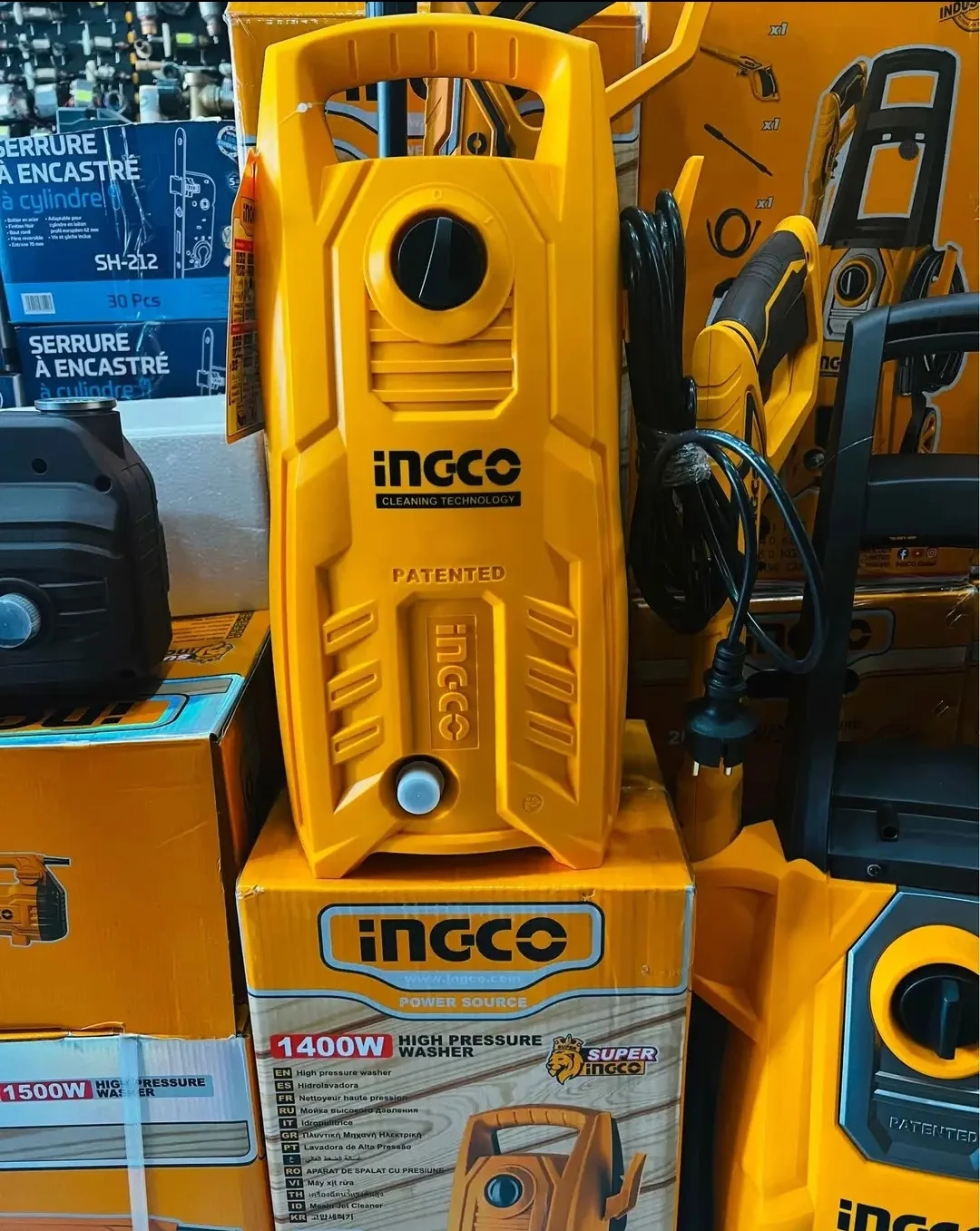 المنتج هو آلة غسيل بالضغط العالي من علامة INGCO بقوة 1400 واط.