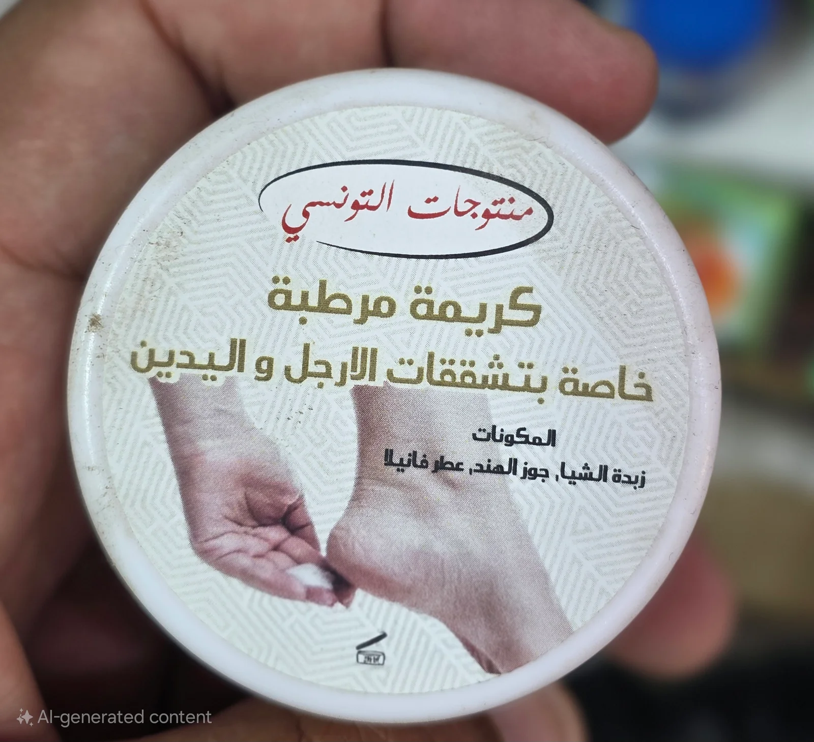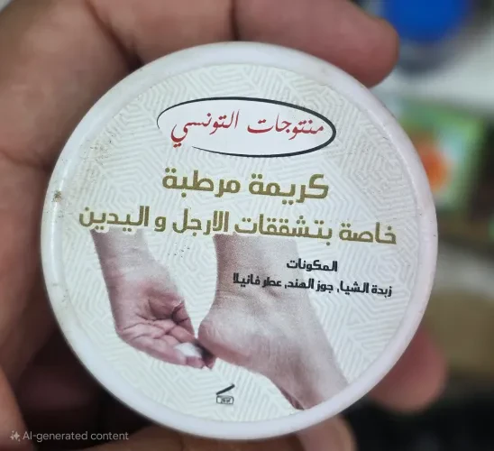 كريمة الترطيب التونسية (منتوجات التونسي كريمة مرطبة)، تركيبة خاصة موجهة لعلاج وترطيب تشققات اليدين والقدمين.