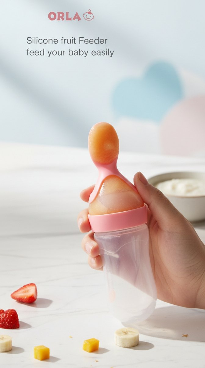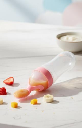 "قدّمي لطفلك الأطعمة المهروسة أو السائلة بكل سهولة وراحة، بضغطة واحدة فقط. ملعقة الإطعام الذكية تجمع بين الرضّاعة والملعقة في تصميم سيليكون ناعم وآمن. إطعام خالٍ من التسريب، وبابتسامة دائمة!"