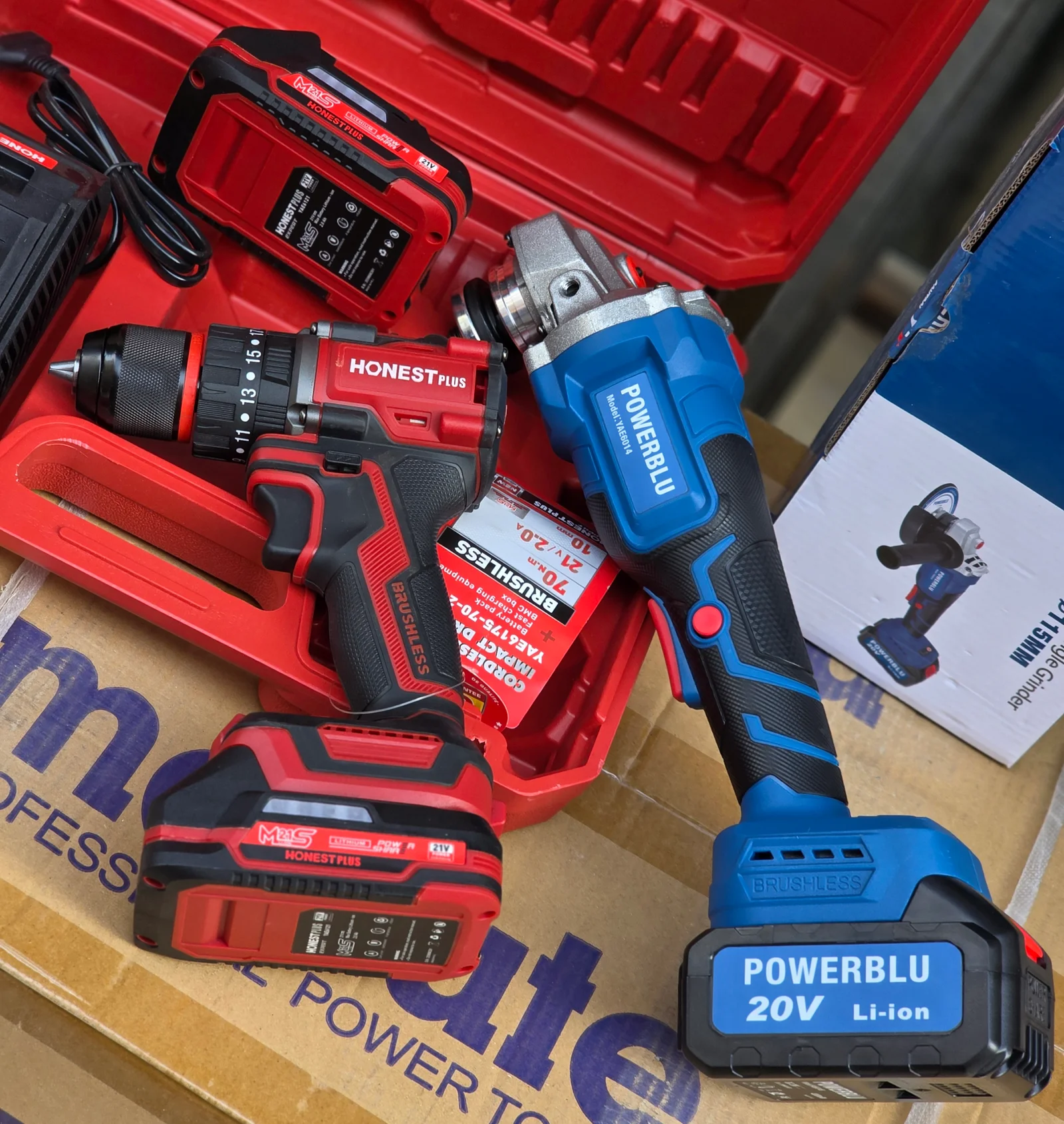 يضم هذا الطقم مثقابًا لاسلكيًا من Honest Plus ومطحنة زاوية لاسلكية من Powerblu، يعملان بنظام بطارية ليثيوم أيون بجهد 20 فولت، مما يوفر أداءً قويًا وسهولة في الاستخدام دون الحاجة إلى الأسلاك.